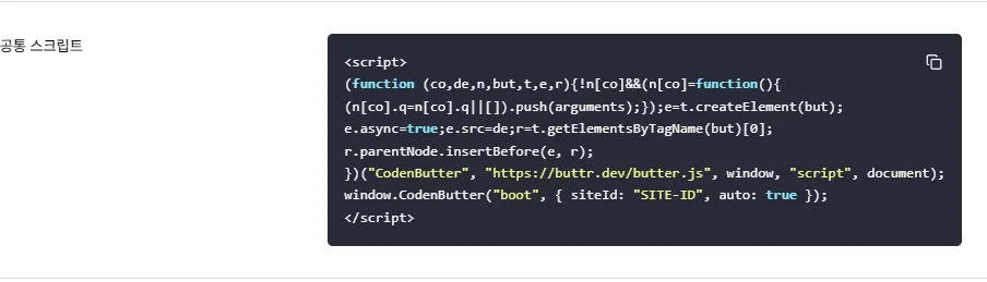 • 스크립트 설치를 원하시는 사이트의 “사이트 수정”메뉴(사이트 옆 톱니바퀴 버튼) 에서 공통 스크립트를 복사하여 삽입해줍니다. (아래 스크립트는 예시 입니다.)