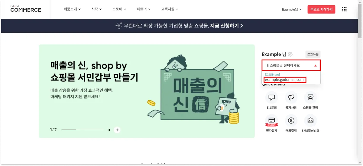 • 고도몰 홈페이지 로그인 후, [내 쇼핑몰을 선택하세요] > [쇼핑몰]을 선택합니다.