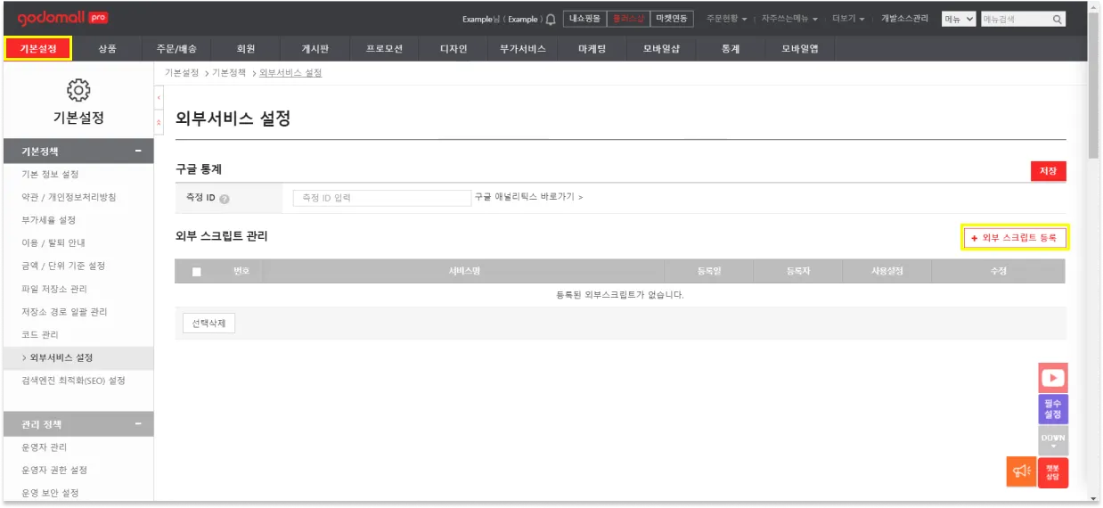 • 고도몰 관리자 페이지에서 [기본설정] > [외부서비스 설정] > [외부 스크립트 등록]을 눌러주세요.