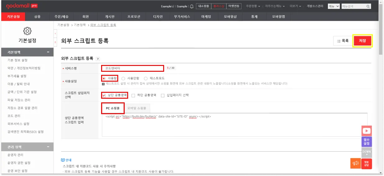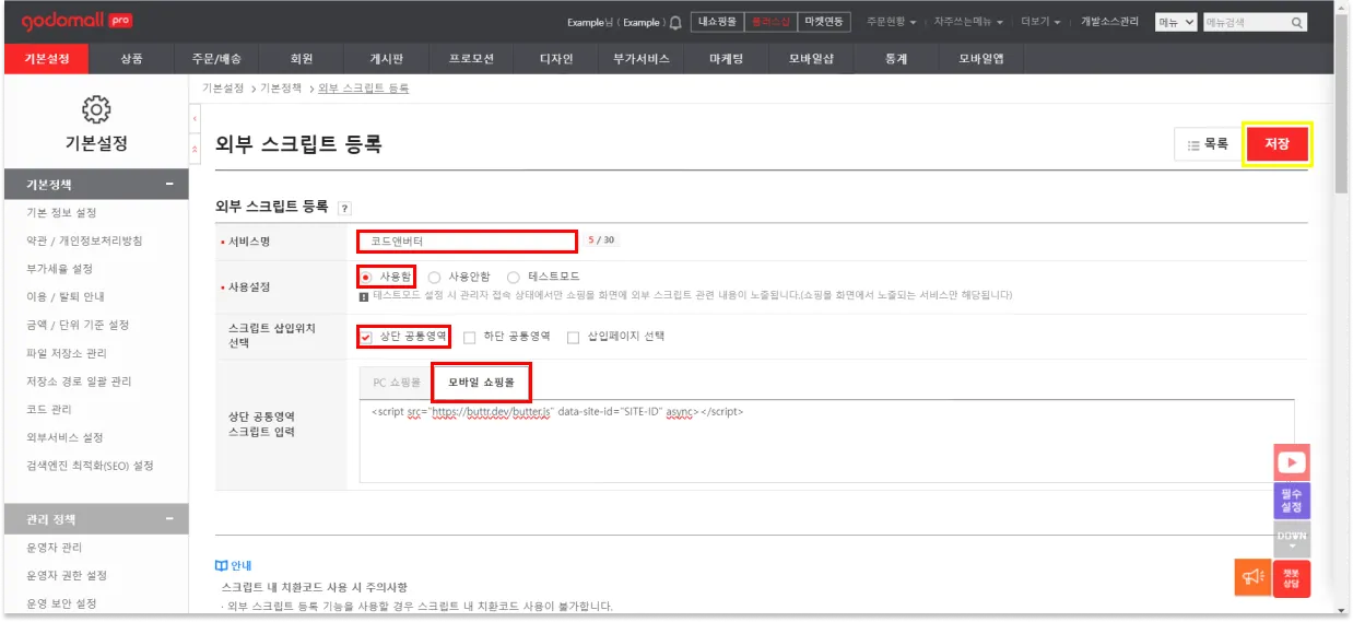 • PC 쇼핑몰과 모바일 쇼핑몰의 [상단 공통영역 스크립트 입력]에 [복사한 스크립트]를 넣고 [저장] 버튼을 누릅니다.
