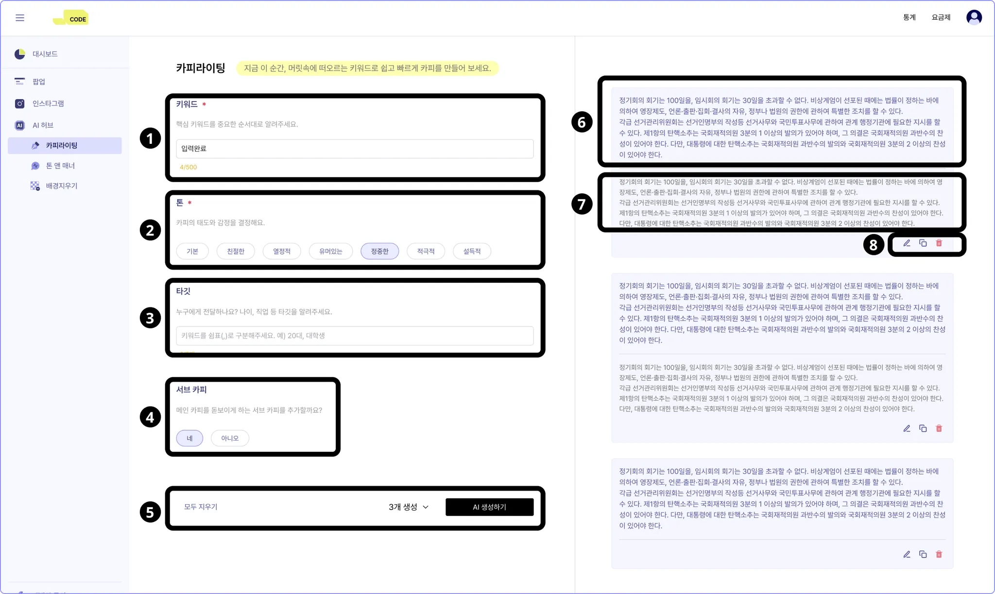 3. 생성하기 : 버튼 클릭으로 카피라이팅을 생성할 수 있어요.