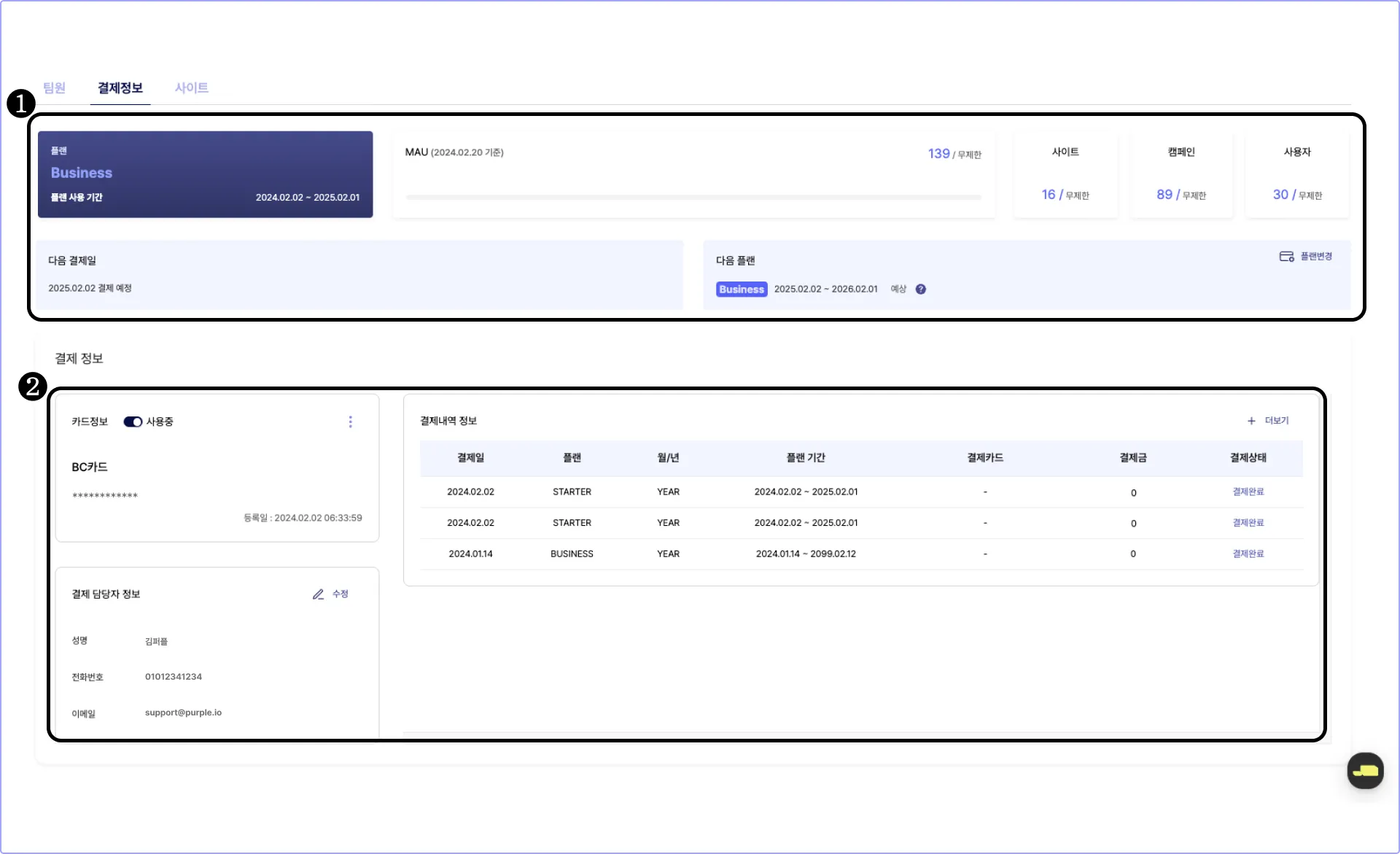 - 사용 중인 플랜에서 등록한 사이트 수, 캠페인 수, 속한 사용자 수를 확인할 수 있어요.