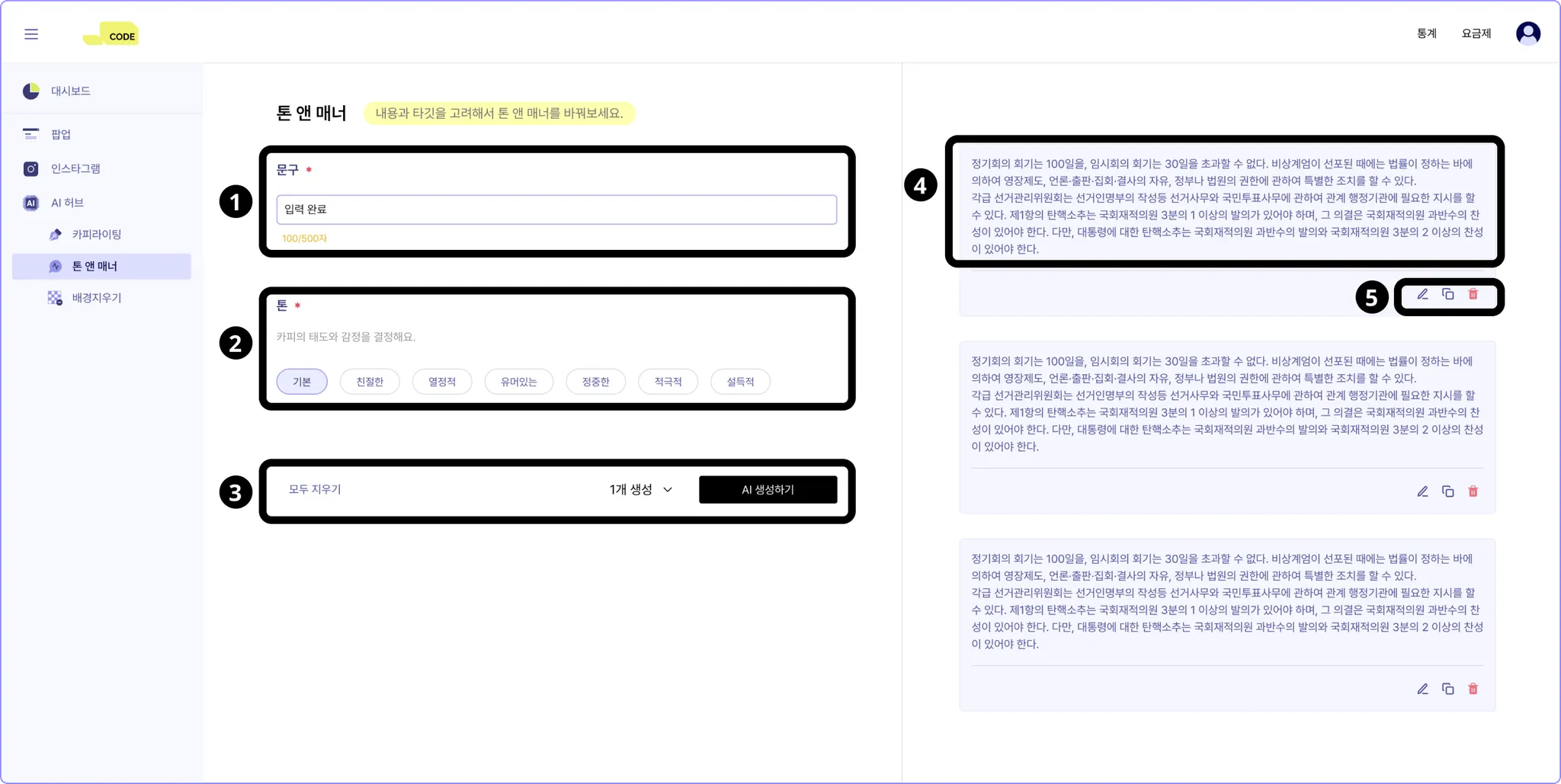 - 생성하기 : 버튼 클릭으로 톤 앤 매너를 변경할 수 있어요.